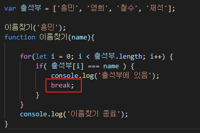 강의 듣다가 break와 retrun 중 어떤것을 사용해야 하는지 의문점이 생겼다. break문 하나의 반복문을 탈출해서 다음에 있어야 할 기능을 실행한다. break문 종료 후 반복문을 벗어나 '이름찾기 종료'라는 콘솔이 찍힌다. return문 하나의 함수에서 탈출해서 종료시킨다. 함수 밖으로 빠져나갔기 때문에 '이름찾기 종료'라는 콘솔이 찍히지 않음 continue문 반복문 내에서 작업을 건너뛸 때 사용 10까지 반복하되 짝수에 해당하는 if문은 건너뛴다.